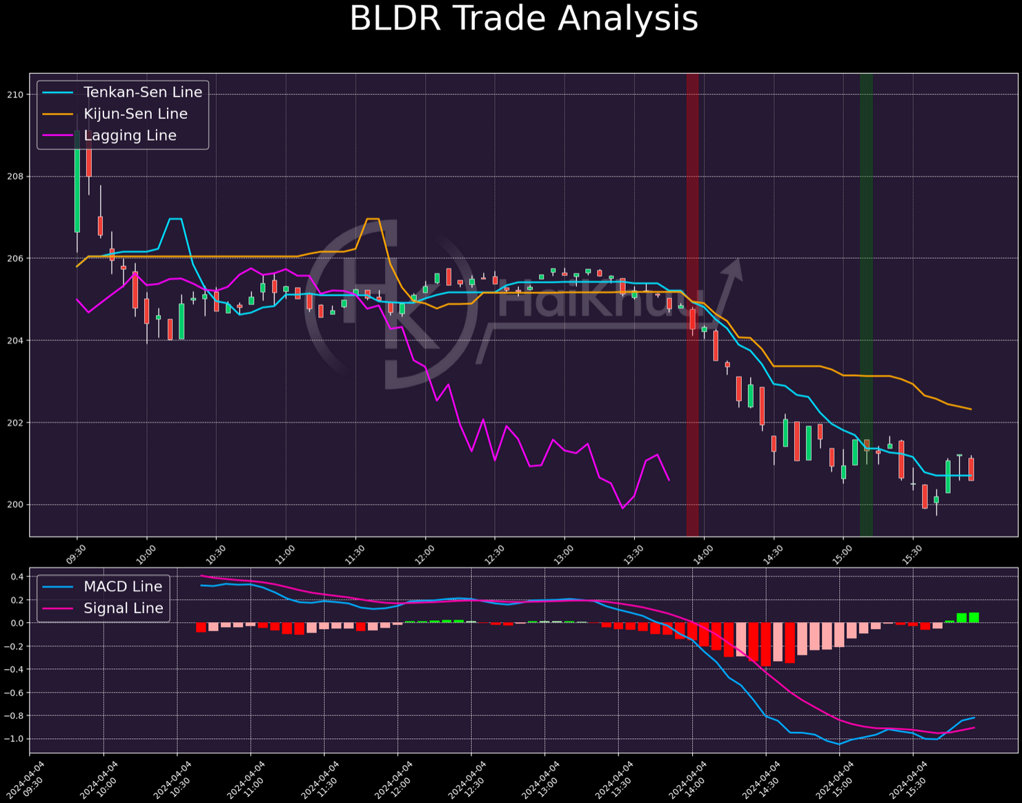 Our best short of the month was on BLDR on April 4th. No re-entries here, but we did make 1.43% on it. Again, I think there’s a lot to like here. The lagging line is where we want to see it, and both the cross and momentum are solid. The only concern I would have had here is that the Kijun-Sen line is pretty flat before our entry, but given that both TK-lines are sloping downwards when we get in, and the strong momentum, I think that red flag is pretty mitigated here. This one was a fantastic trade, with great returns.