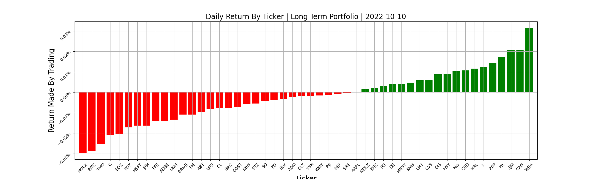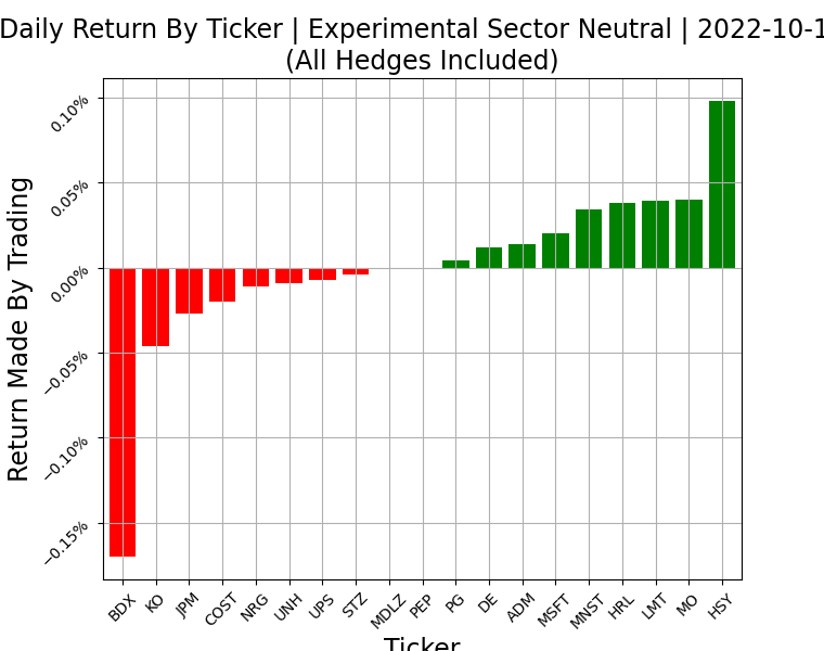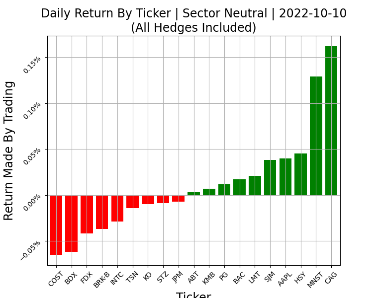 Looking at a break down of the sector neutral systems, you’ll notice SN has a pretty similar distribution to the long term portfolio, sector hedged. Its performance was almost an exact match to the LTP with sector hedging, so this is to be expected. As a consequence, there are no major outliers to investigate as a cause of its performance. Its modeling didn’t fail today, it just didn’t add anything new.