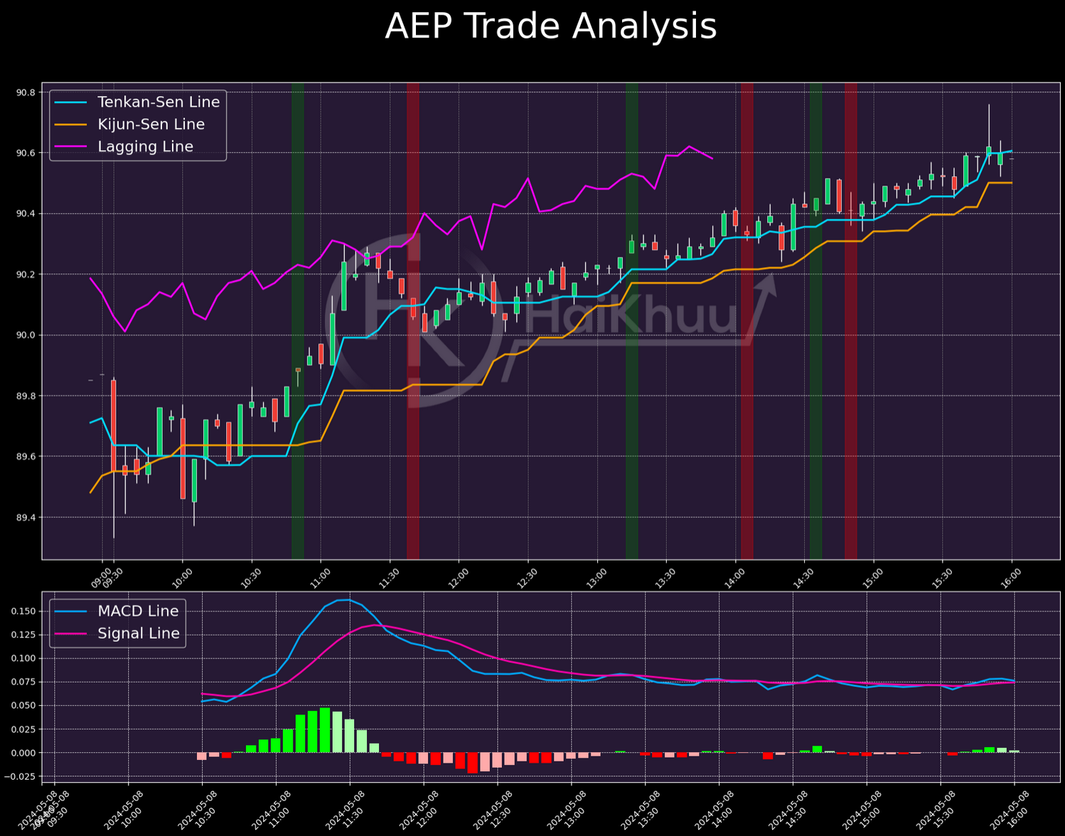 Our big winner today was AEP, where we made 0.17% across 3 entries. I’ll say right away that I like our first entry a lot, but not either of our re-entries. On the initial entry, our conditions are fairly strong. The cross is solid, a good MACD, and cooperative lagging line. That said, by the time we make re-entries, MACD had been negative for some time, and during both re-entires, was barely above 0. This is a frequent red flag, and one we’ve discussed before on these reviews. It’s readily obvious to a human trader when this is happening, but it’s difficult to catch algorithmically, since it requires hard thresholds relative to prior levels. I can say with certainty that I would have ignored both re-entries, in which case the total return would have increased to 0.24%.
