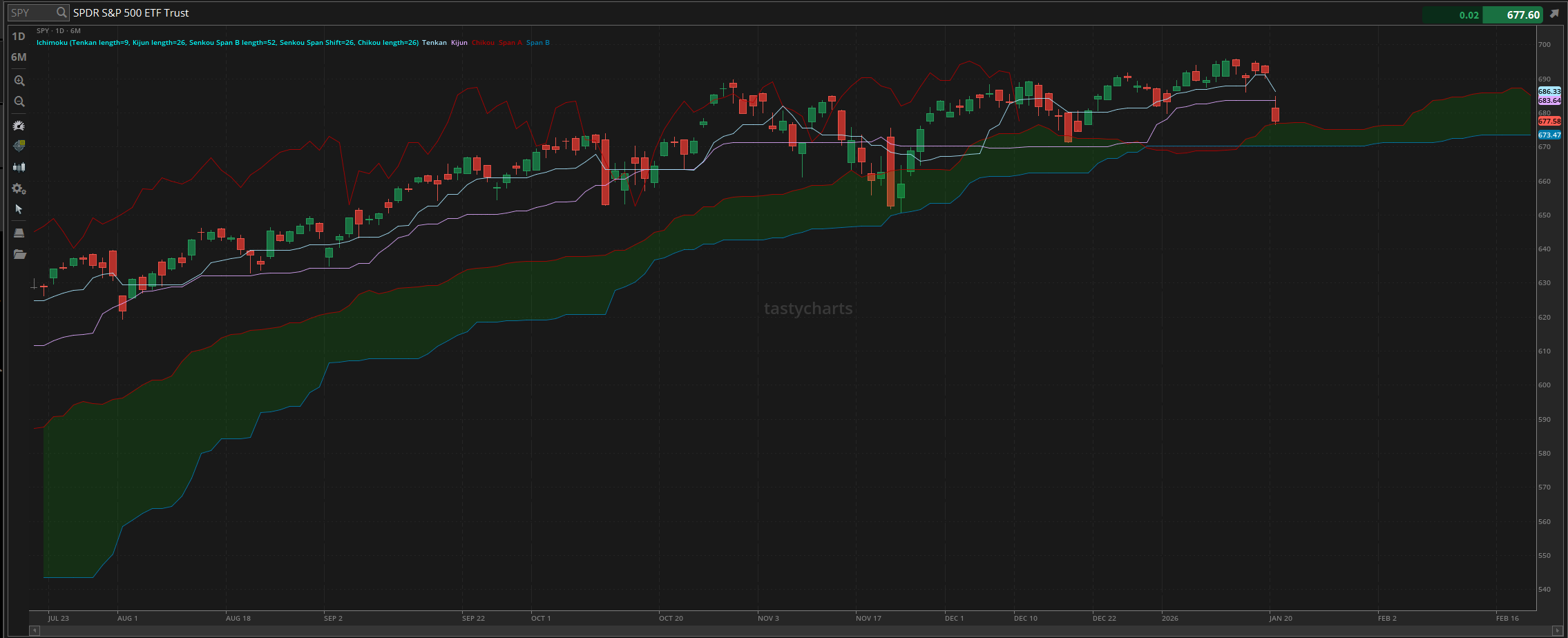 $SPY did recover slightly, moving up to make the official high of the day, trading at $684.76, but once the bullish momentum slowed down, it was just a disgusting bearish trend throughout the rest of the day. We dropped after the lunchtime lull and continued to drop all the way until close, where $SPY ultimately went on to test the daily cloud support and made the official low of the day, trading at $676.57.