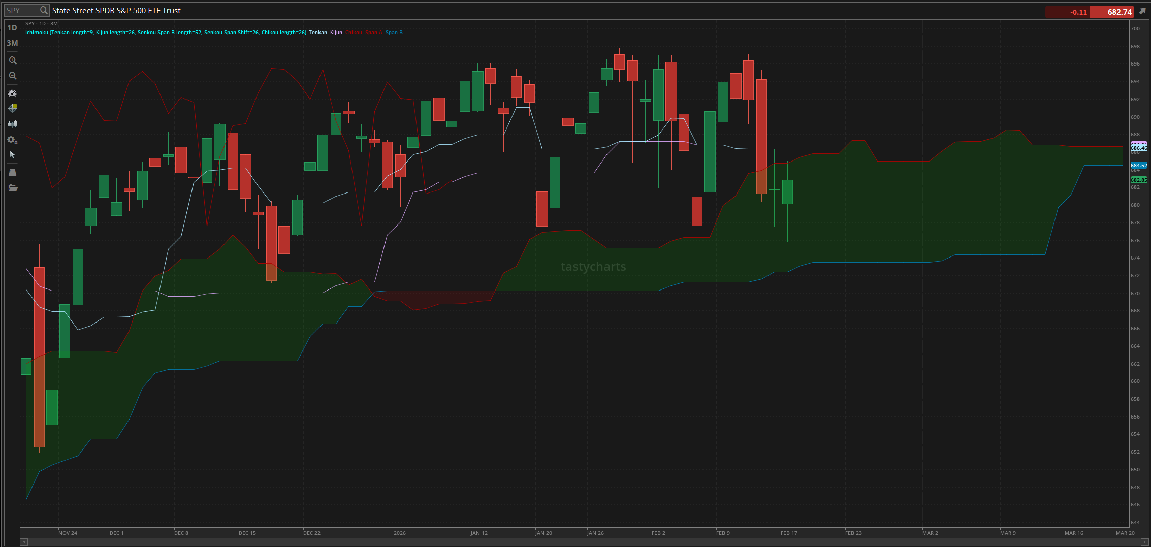 So, we started the week with markets slightly down, opening at $680.09, down about $2 from Friday's close. Right after opening, we watched as the markets quickly popped up, then crashed back down within the first hour of the day, and continued chopping around before hitting the official low of the day early in the morning, trading at $675.78.