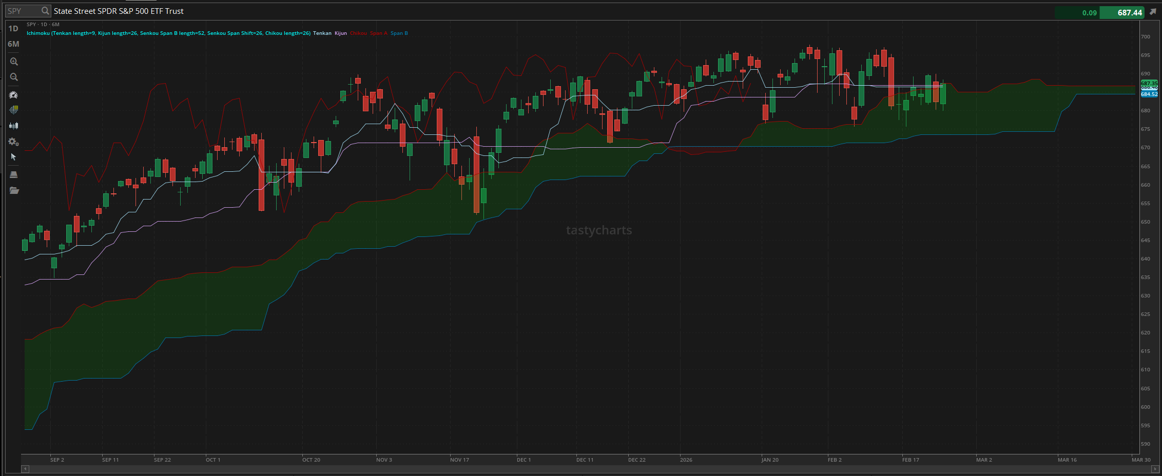 The major resistance levels you should look for are the daily conversion & baseline resistance, the daily cloud resistance, and the psychological resistance at $SPY $690. Assuming we clear all of those levels, I do not see a reason why we cannot continue to break out with relative confidence. So, it will be interesting seeing where the markets take us. Just please, tread lightly, practice safe risk management, and have an absolutely amazing time in the process!