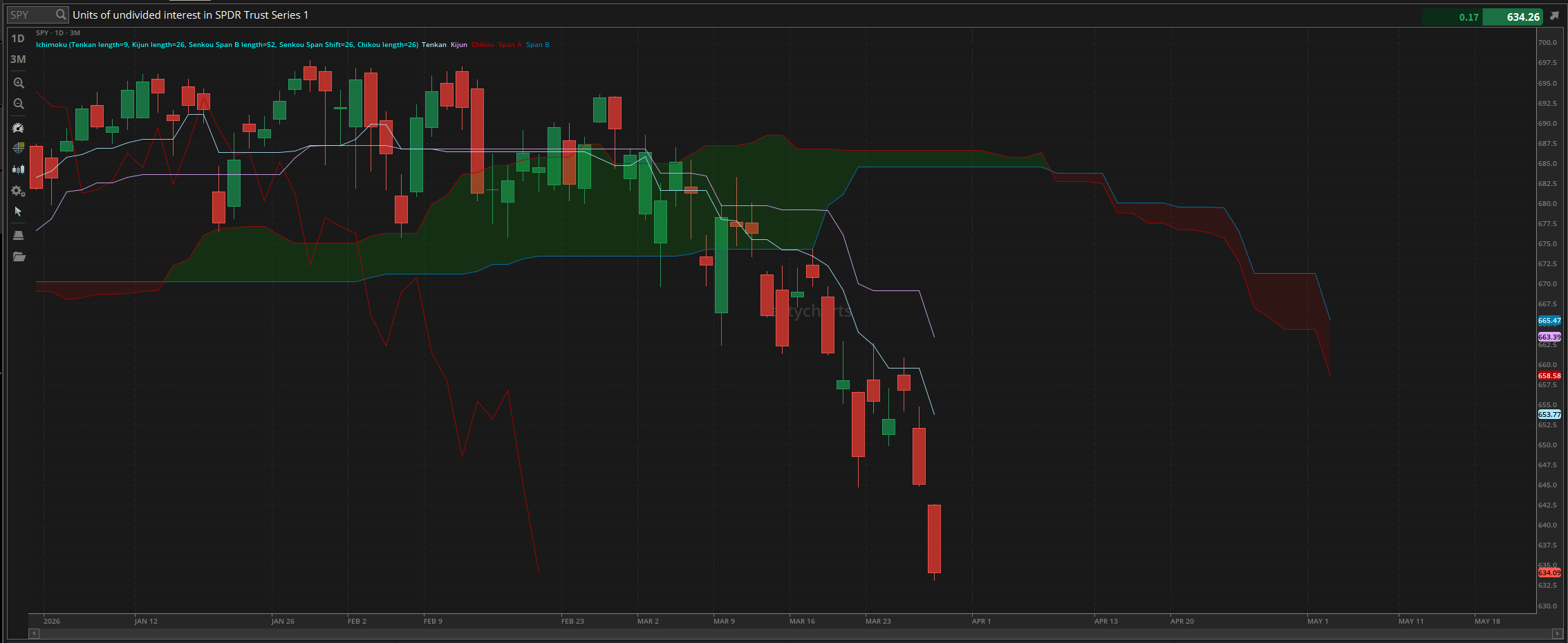 We started last week with $SPY trading at $657.73, and conditions honestly looked alright. We were testing the $660 resistance, and conditions honestly did not look that bad. We watched as $SPY moved up, tested the daily conversion line resistance, and watched as $SPY continued to remain extremely confused in the process. As $SPY moved up after open on Monday, we watched as we made the official high of the week trrading at $662.62, before watching as we slowly came down, rejected that $660 point and struggled to retain it, we dropped through the rest of Monday, struggled into tuesday, and watched as we gapped up slightly to test $660 once again on Wednesday, before struggling again. We have continued to reject that daily conversion line resistance, and as a result, the markets only continued to display weakness.