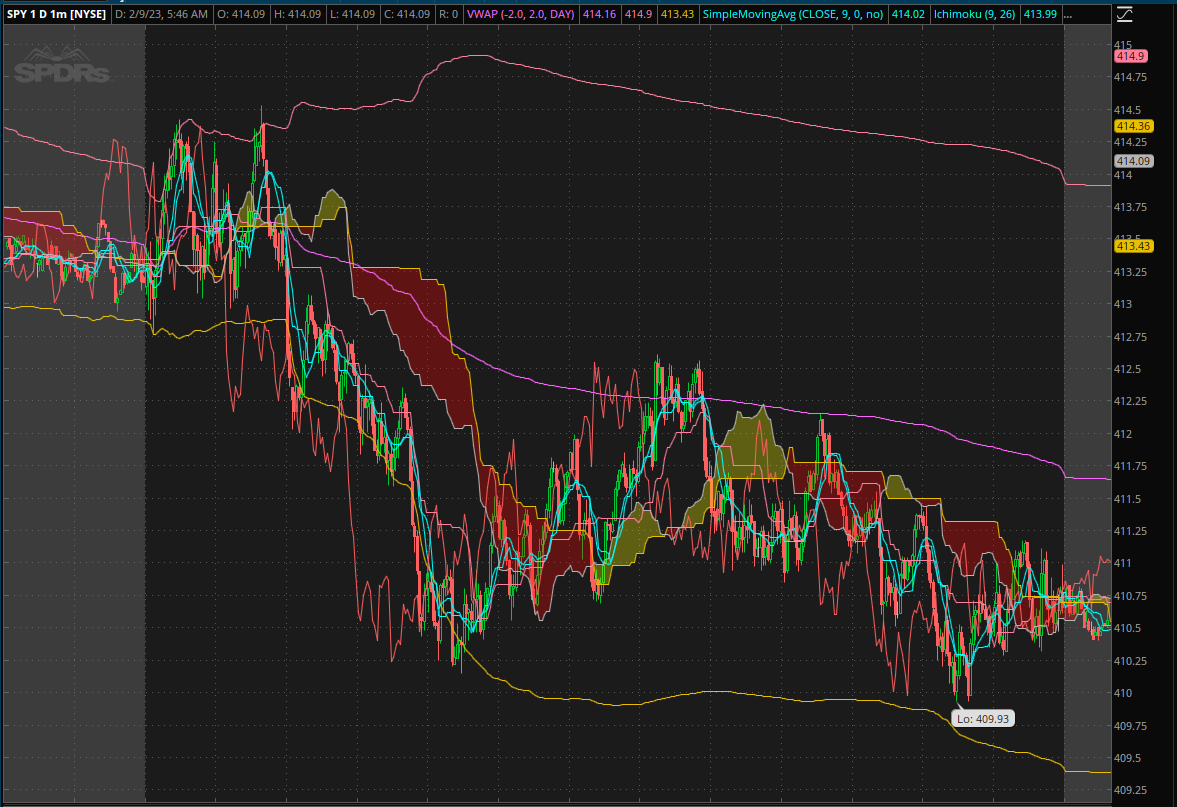 The day started out extremely optimistic as we started to run at open. $SPY opened the day trading at $413.18 and quickly ran up to test $414.25 twice before rejecting the resistance and continually coming down as a result. We watched as $SPY continued to sell throughout the morning, making a relative low trading at $410.25. We did see a nice recovery after making the relative low, with $SPY coming back up to VWAP but rejecting the five-minute cloud resistance. After that rejection, we watched as a downtrend formed, resulting in chop and continual selling throughout the day.