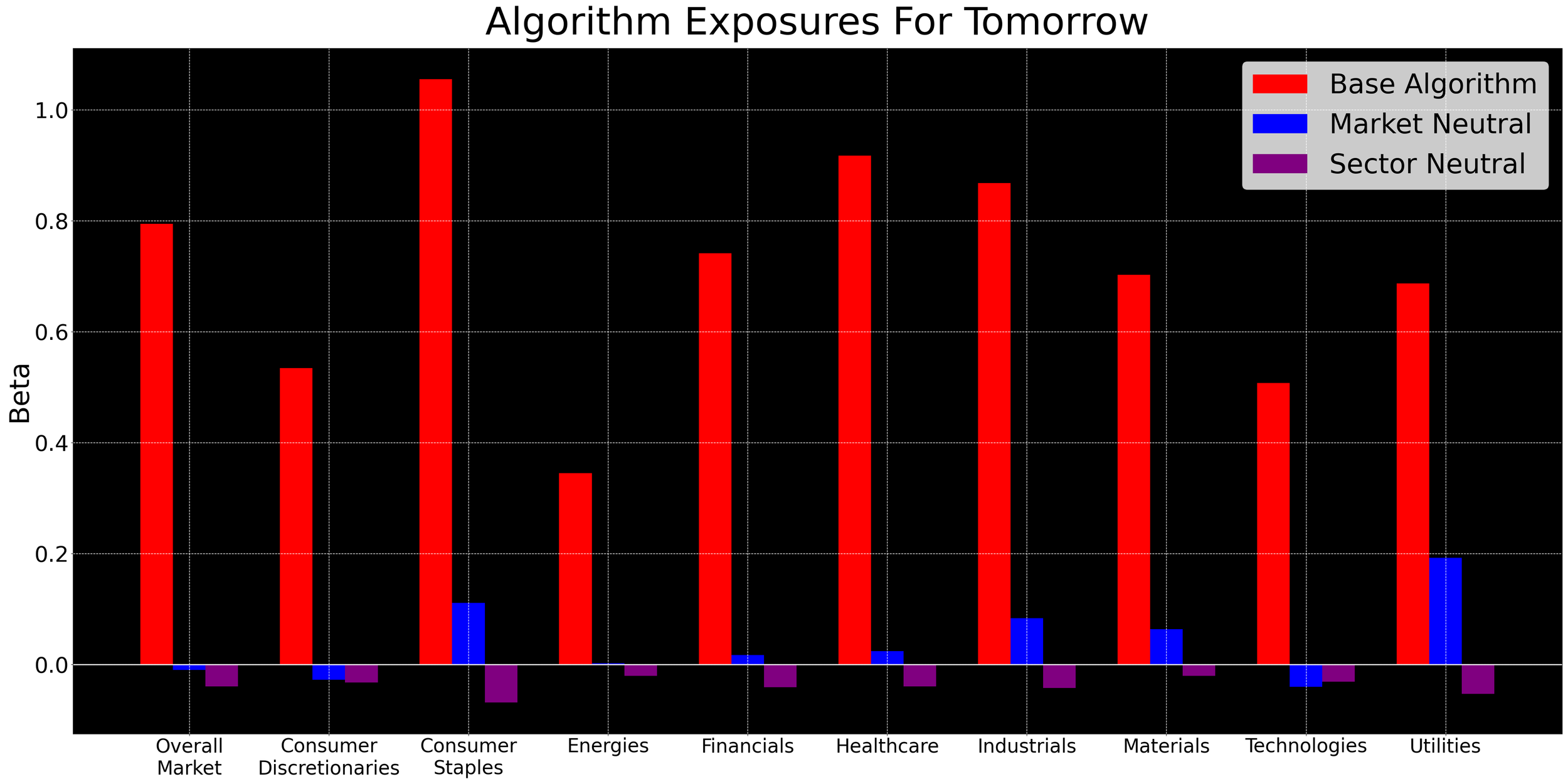 This test also serves to confirm an earlier hypothesis of mine. With our previous portfolio, I recommended market neutral on days of market uncertainty, to preserve our higher betas in defensive sectors. Since our new portfolio has a higher proportion of its betas in less defensive sectors, this is no longer the move. For the foreseeable future, I’m leaning towards base algorithm most days, sector neutral when we don’t feel good about the market, and variable sector neutral when we’re too uncertain to pick one.