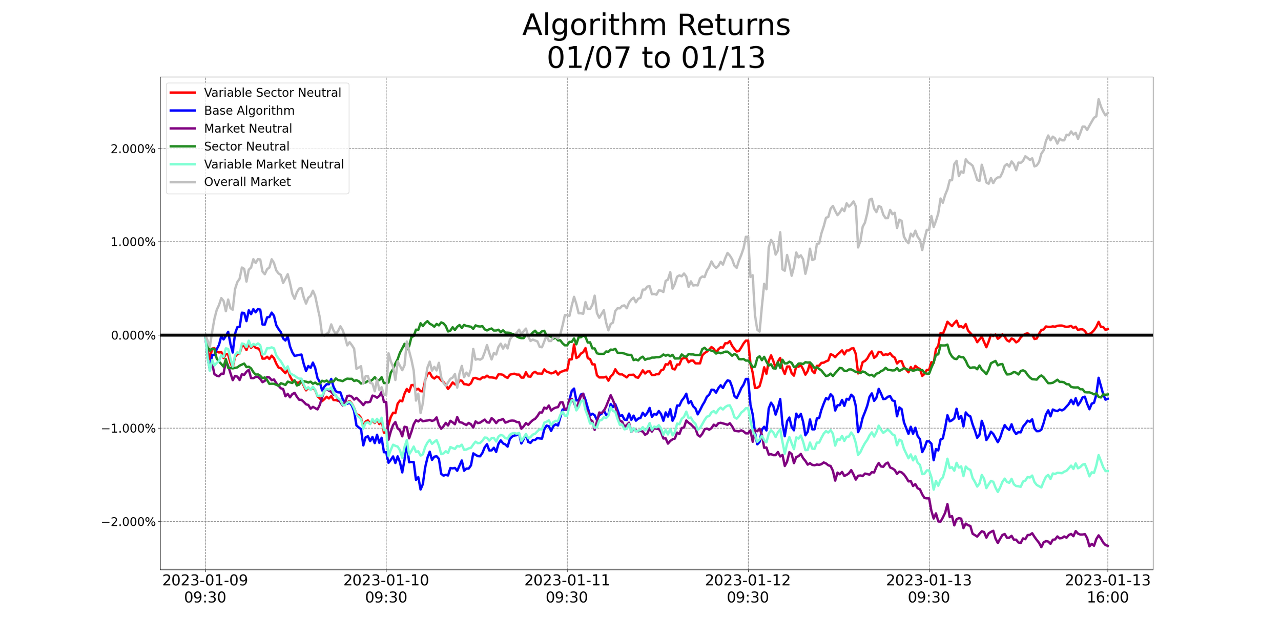 Based on this backtest, all of our algorithms are able to generate clear alpha over the current portfolio, which is a great sign. Further, we generally only expect almost every week to be positive when a strategy has a Sharpe ratio of 3.0 or greater. Given that only one of our strategies even comes close in this backtest, this week shouldn’t be a major red flag.