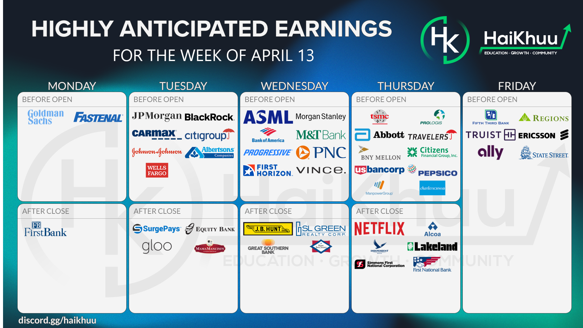 AM Earnings: Taiwan Semiconductor (TSM), Prologies (PLD), Abbott (ABT), Travelers Companies (TRV), Bank of New York (BK), Citizens Financial (CFG), U.S. Bancorp (USB), PepsiCo (PEP), ManpowerGroup (MAN), Charles Schwab (SCHW)